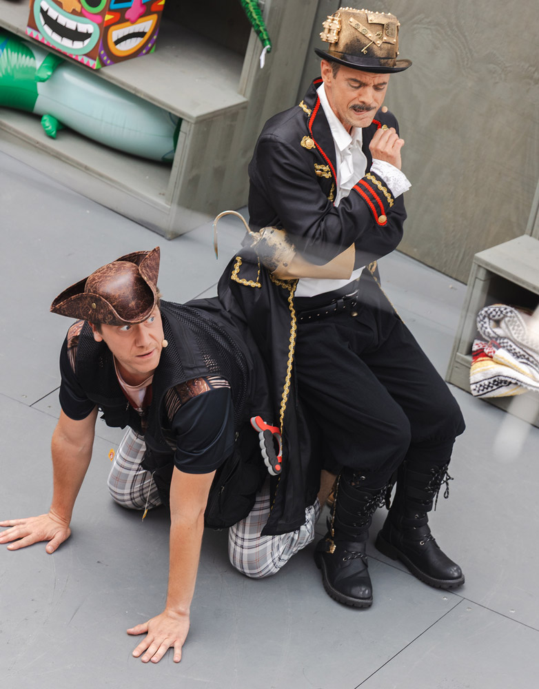 Peter Pan: Anna Prestel, Violetta Mai // Wendy: Leni Kleinheinrich, Linda Hochholzer // Mrs. Darling, Tiger Lilly, Bill Jukes, Tootles, Meerjungfrau: Benjamin Plautz // Curly, Krokodil, Meerjungfrau, Indianer: Florian Schmidt-Gahlen // John, Alf Mason, Slightly, Medizinmann: Leo-Raphael Steiner // Capt’n Hook, Mr. Darling, Häuptling Hau, Nips: Chris Urwyler // Smee, Michael, Indianer: Dennis Wilkesmann